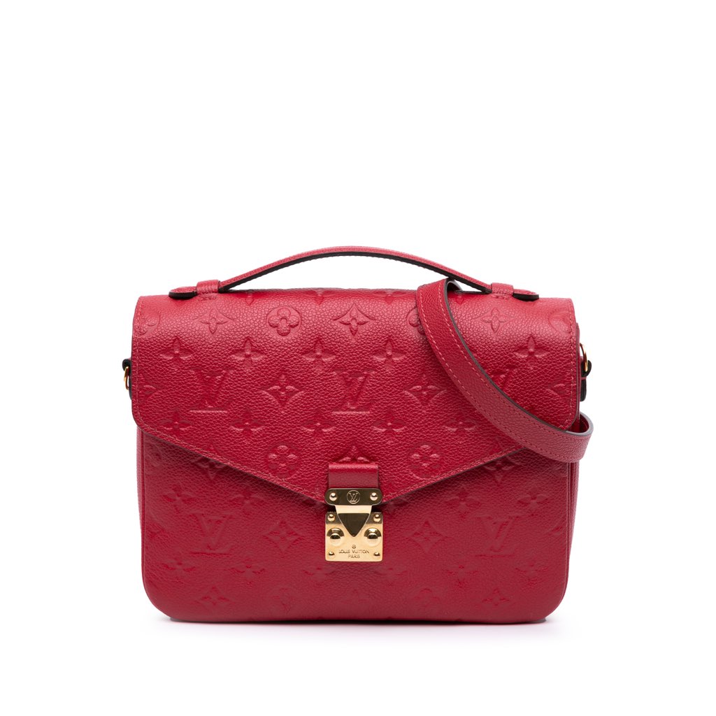 The Pochette Metis features a monogram empreinte body, a flat top handle, a detachable flat leather strap, a front flap with push lock closure, an exterior back zip pocket, two open interior compartments, and an interior slip pocket.