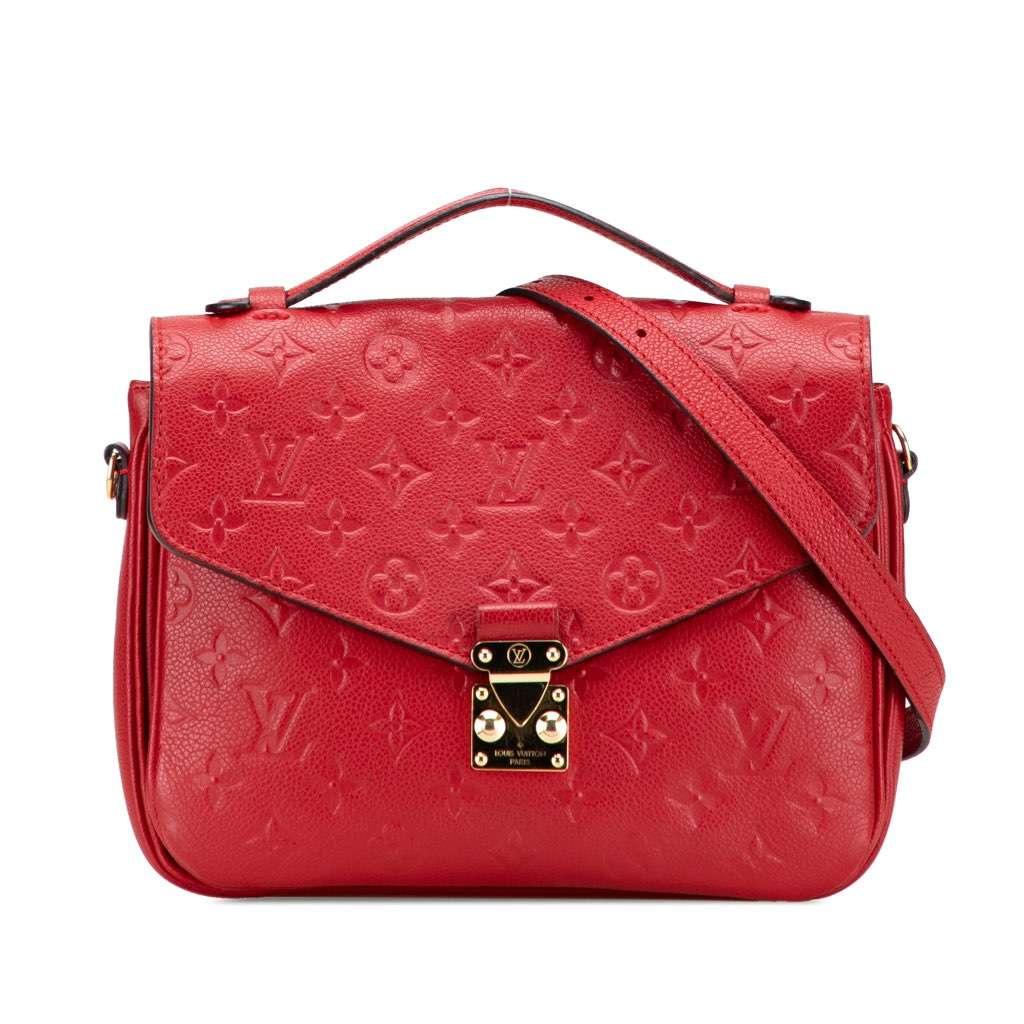 The Pochette Metis features a monogram empreinte leather body, a flat leather top handle, a detachable flat leather strap, a front flap with an S-lock closure, an exterior back zip pocket, open compartments, and an interior slip pocket.