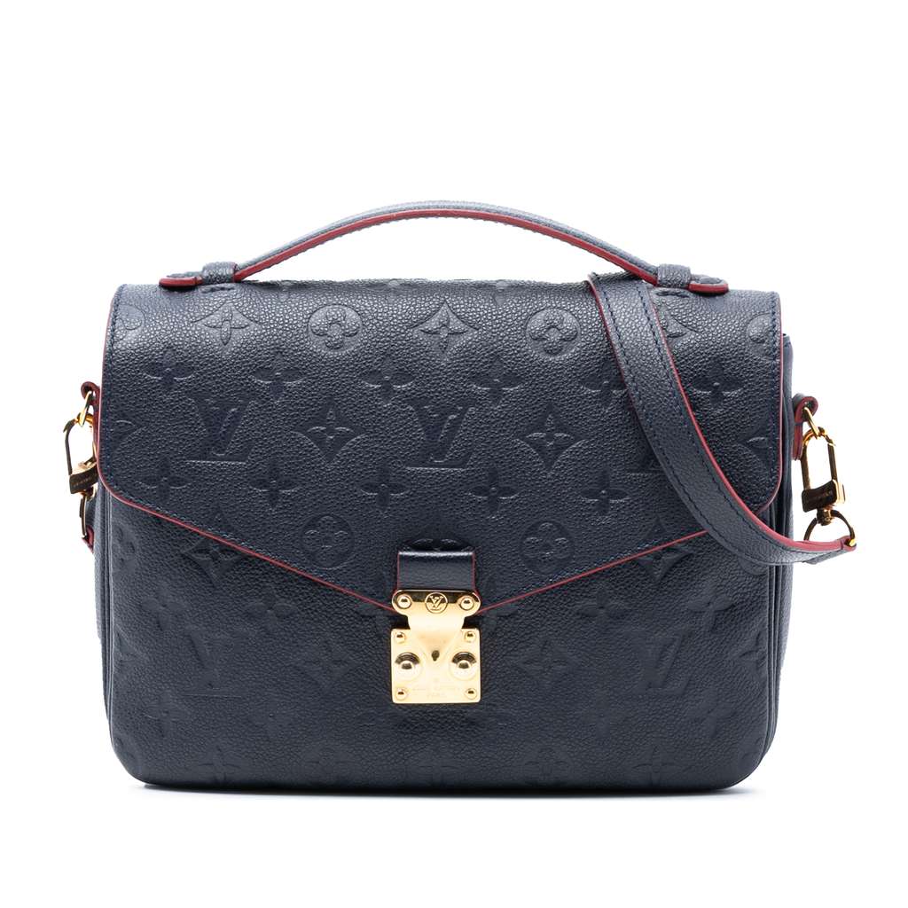 The Pochette Metis features a monogram empreinte leather body, a flat leather top handle, a detachable flat leather strap, a front flap with an S-lock closure, an exterior back zip pocket, open compartments, and an interior slip pocket.