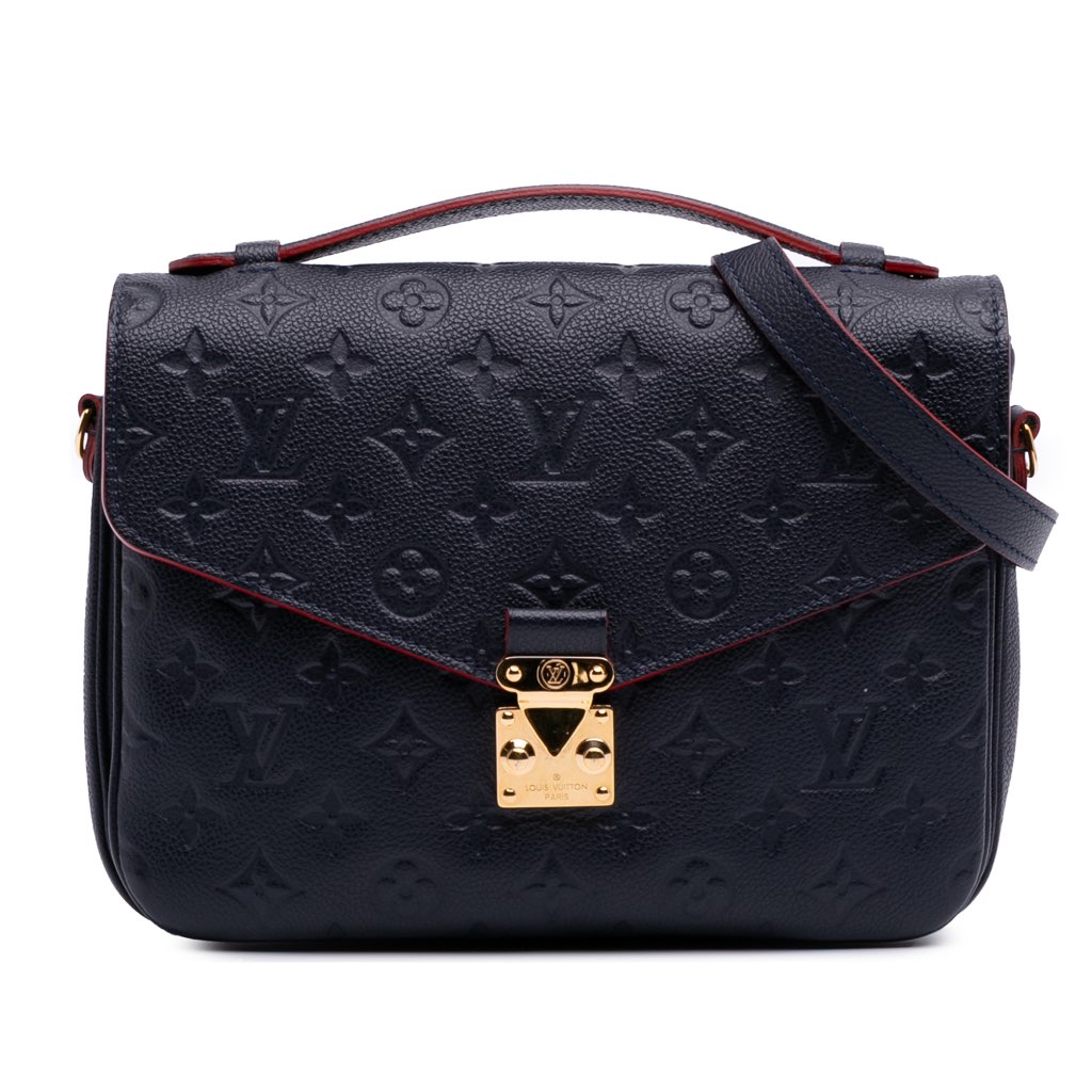 The Pochette Metis features a monogram empreinte leather body, a flat leather top handle, a detachable flat leather strap, a front flap with an S-lock closure, an exterior back zip pocket, open compartments, and an interior slip pocket.