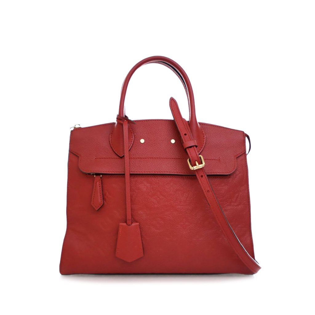 The Pont Neuf MM features a monogram empreinte leather body, rolled handles, a detachable flat strap, a top zip closure, an exterior front zip pocket, and an interior slip pocket.