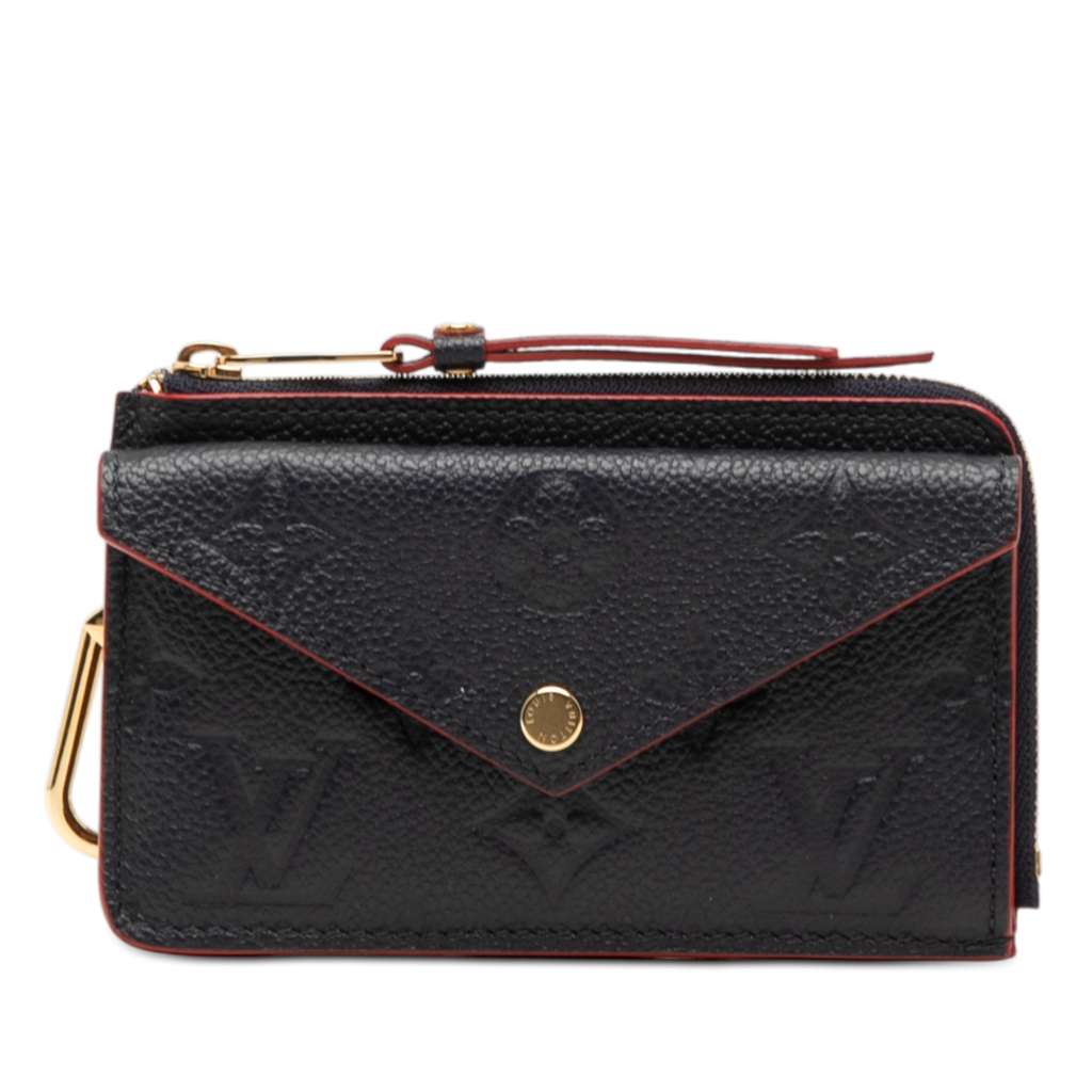 This card holder features a monogram empreinte leather body, a top zip closure, an exterior front flap pocket with press stud closure, and an exterior back slip pocket.