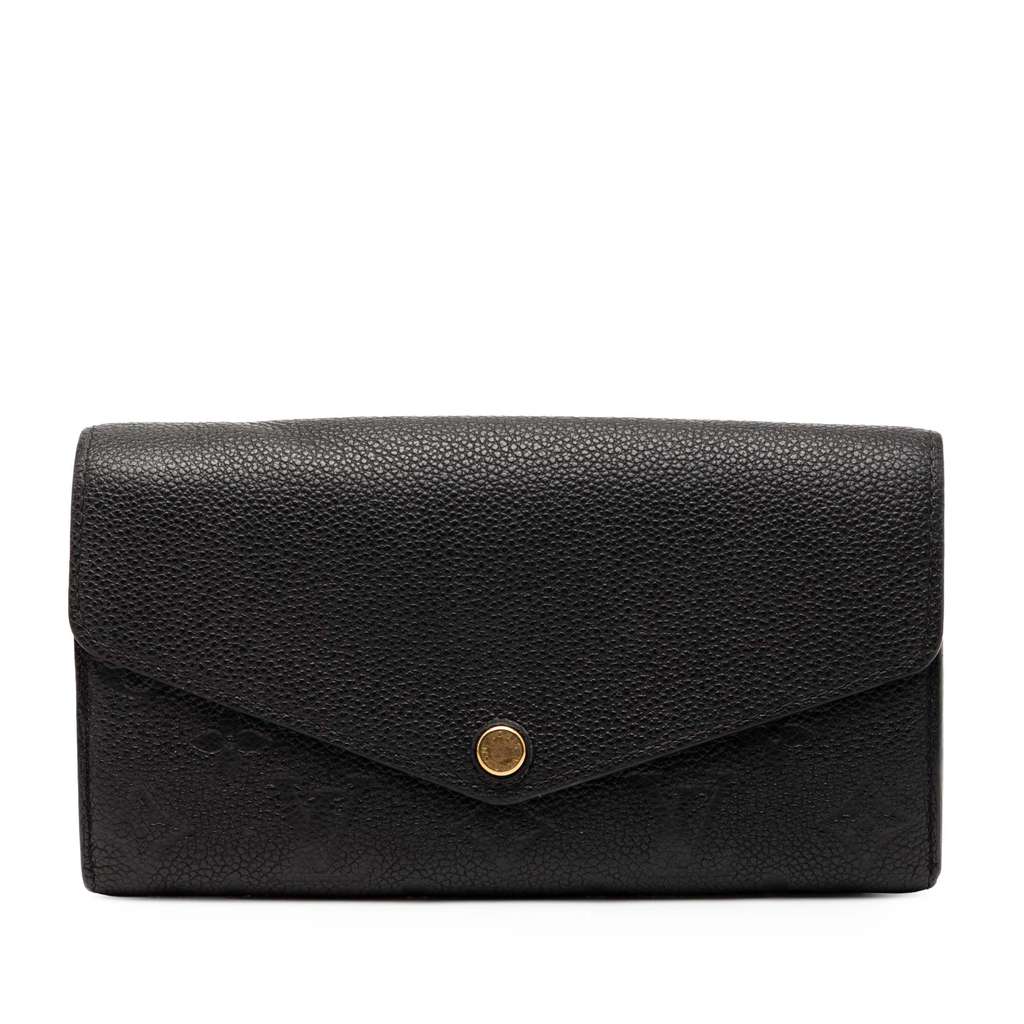 The Sarah features a leather monogram empreinte leather body, a front flap with a snap button closure, and interior zip and slip pockets.