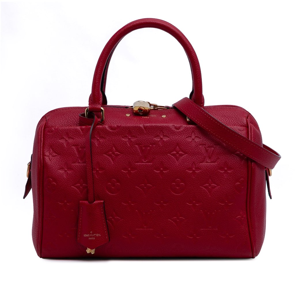 The Speedy Bandouliere 25 features an empreinte leather body, rolled leather handles, a top zip closure, a detachable flat leather strap, and interior zip and slip pockets.