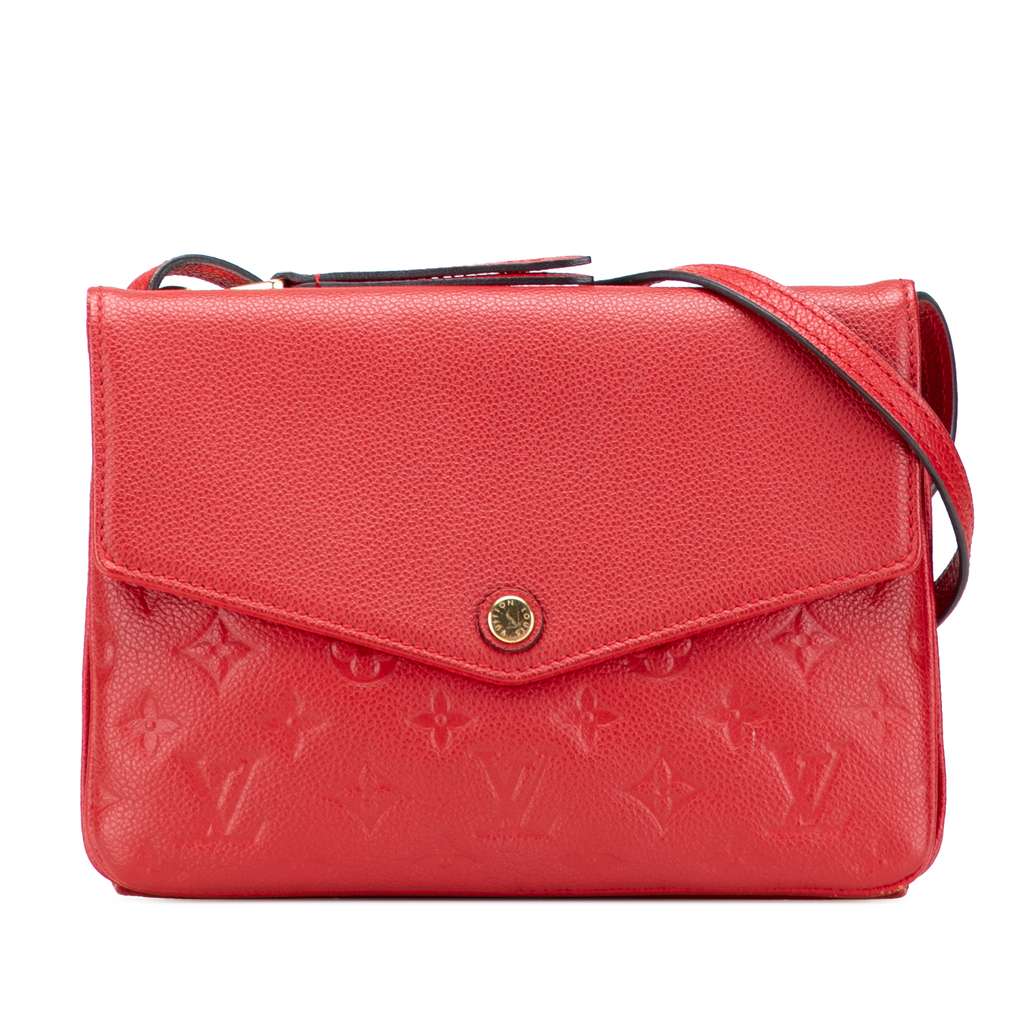 The Twice features a monogram empreinte leather body, an adjustable flat leather strap, a front flap with snap closure, a back zip compartment, and an interior compartment with magnetic closure.