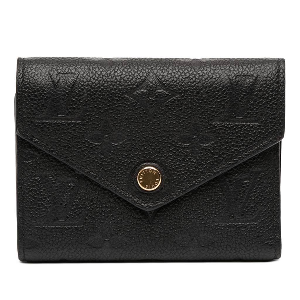 The Victorine wallet features a monogram empreinte leather body, a top flap with a push button closure, and interior zip and slip pockets.