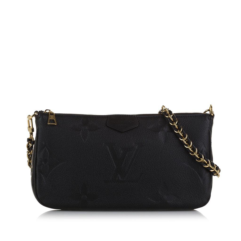The Pochette Felicie features a monogram empreinte body, a detachable gold-tone chain strap, a top flap with snap button closure, and an interior slip pocket.