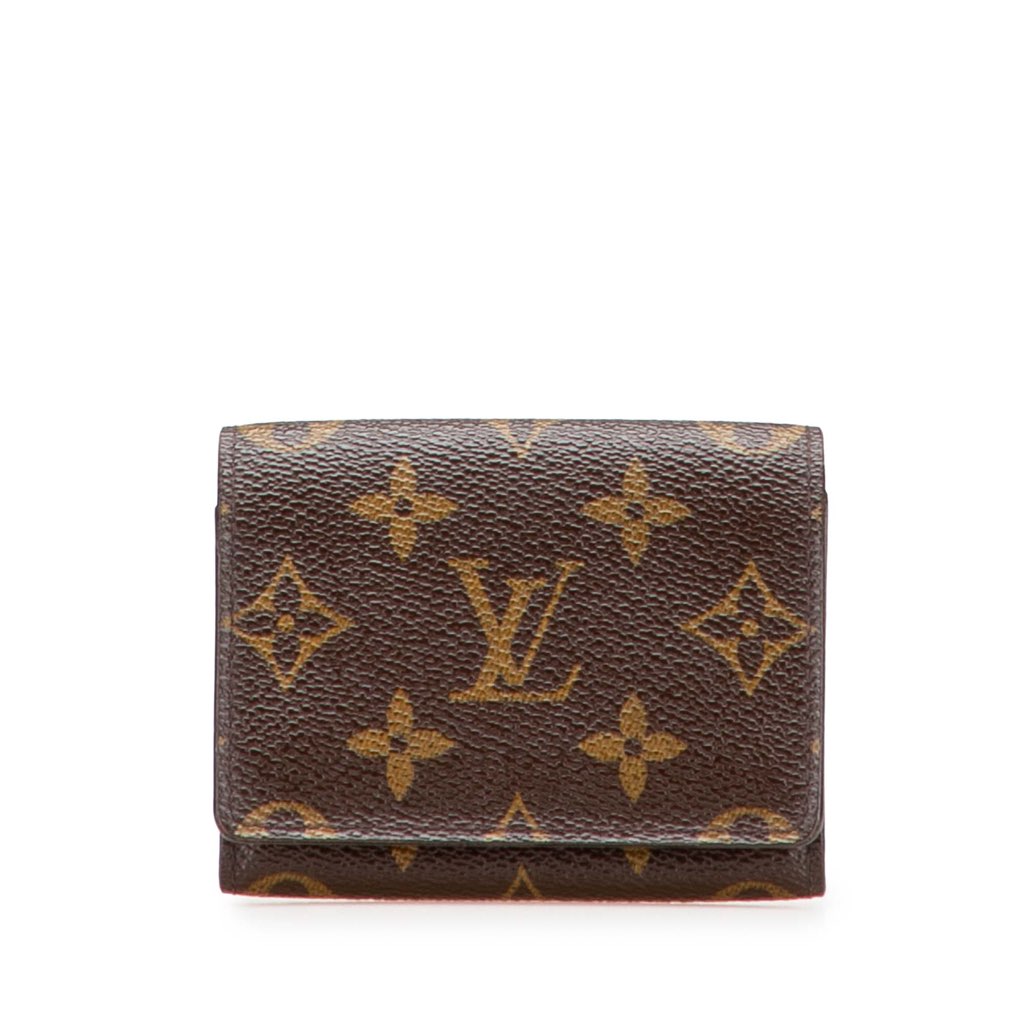 This card holder features a monogram canvas body, a flap with a snap button closure, and an interior slip pocket.