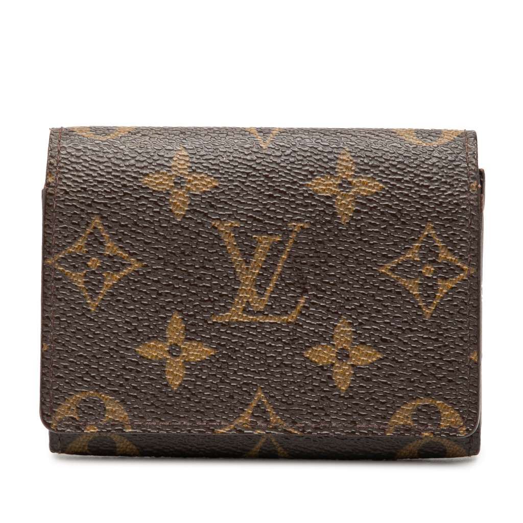 This card holder features a monogram canvas body, a front flap closure, and interior slip pockets.