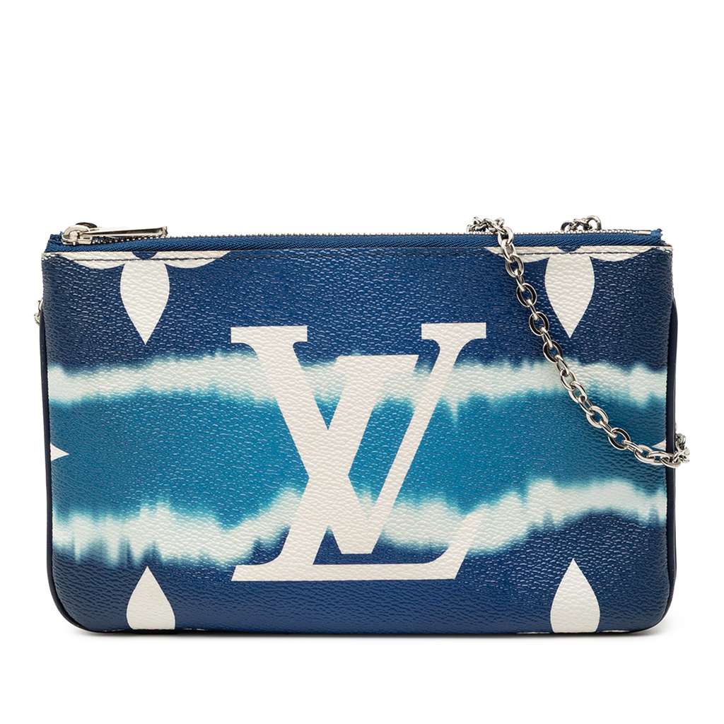 The Double Zip Pochette features the monogram canvas body, a silver-tone chain strap, a top zip closures, and interior slip pockets.
