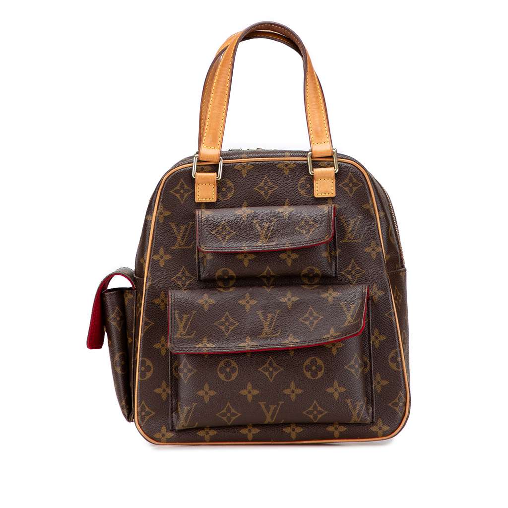 The Excentri-Cite features a monogram canvas body with vachetta leather trim, flat vachetta leather straps, a two-way top zip closure, exterior flap pockets, and an interior slip pocket.