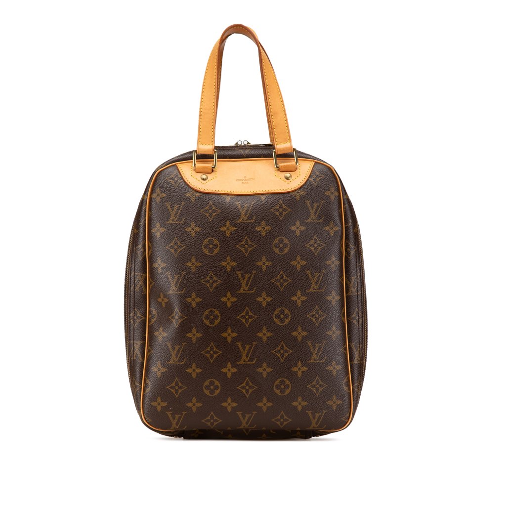 The Excursion features a monogram canvas body with vachetta leather trim, flat vachetta leather handles, a zip-around closure, and an interior slip pocket.