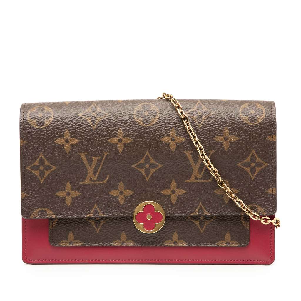 The Flore crossbody bag features a monogram canvas body with leather trim, a chain shoulder strap, a front flap with magnetic snap closure, and interior zip and slip pockets.