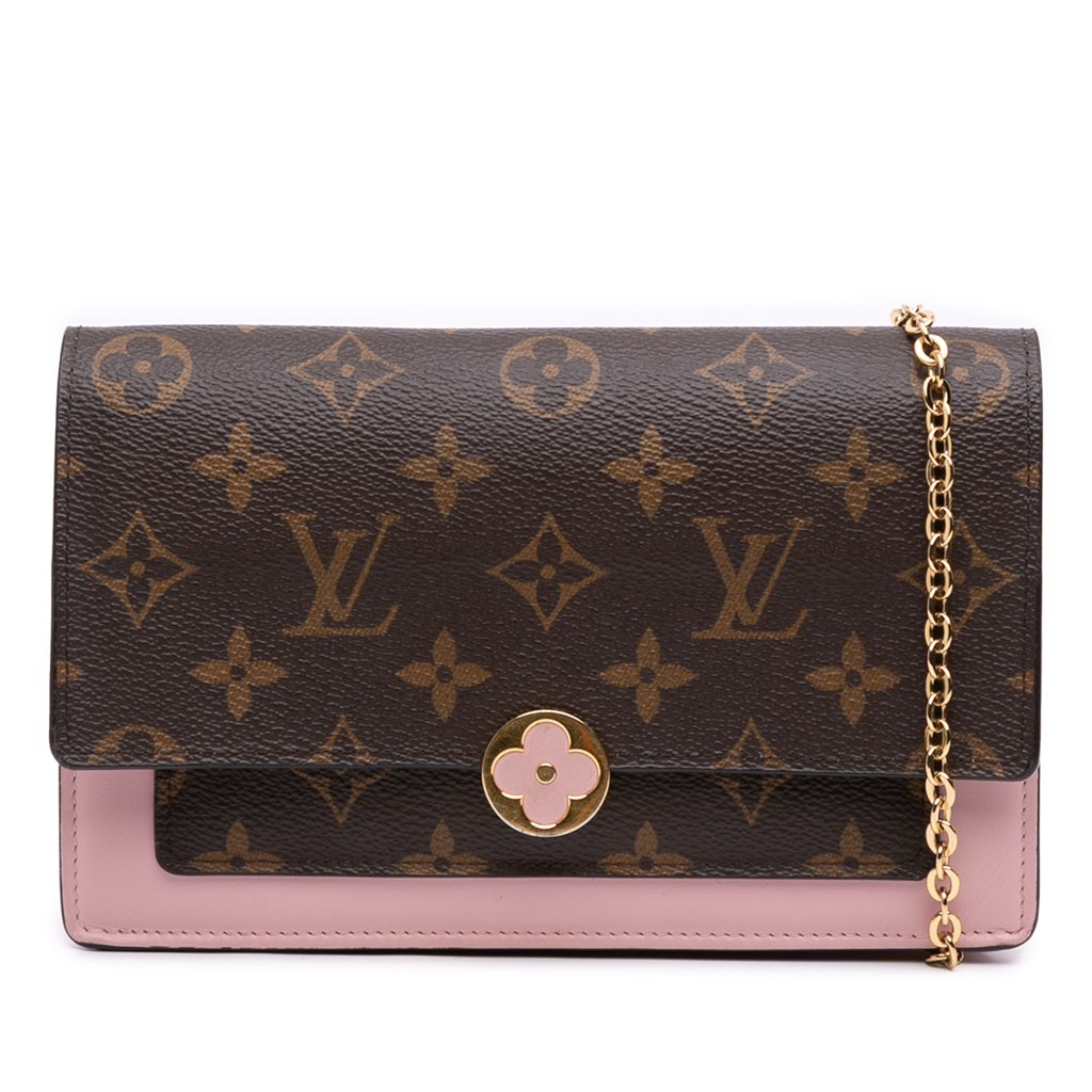 The Flore crossbody bag features a monogram canvas body with leather trim, a chain link shoulder strap, a front flap with snap closure, and interior zip and slip pockets.