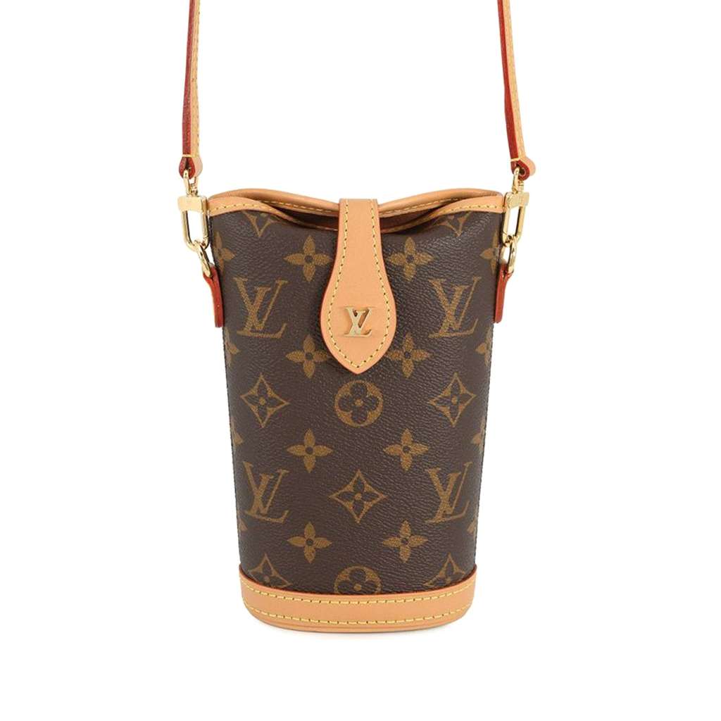 The Fold Me Pouch features a monogram canvas body with vachetta leather trim, a detachable flat vachetta leather strap, and a top strap with magnetic snap closure.