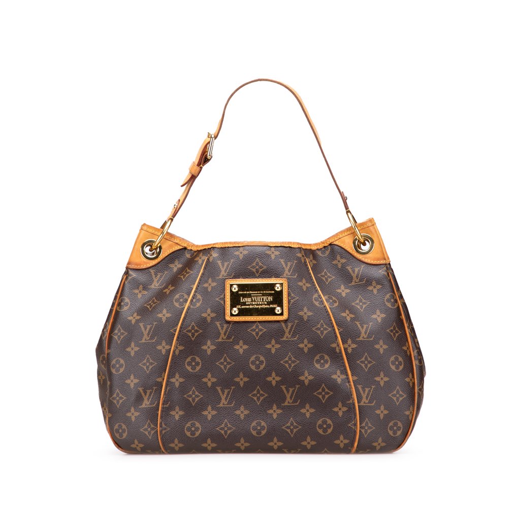 The Galliera features a monogram canvas body with vachetta leather trim, a flat vachetta strap, an open top with a magnetic closure, and an interior flap pocket.