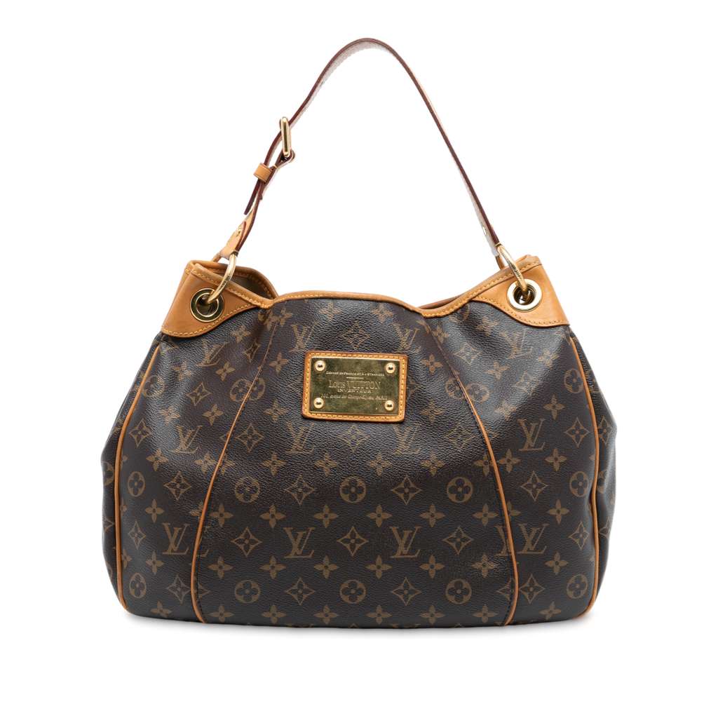 The Galliera PM features a monogram canvas body with vachetta leather trim, a flat vachetta leather strap, an open top with magnetic snap closure, and an interior flap pocket.