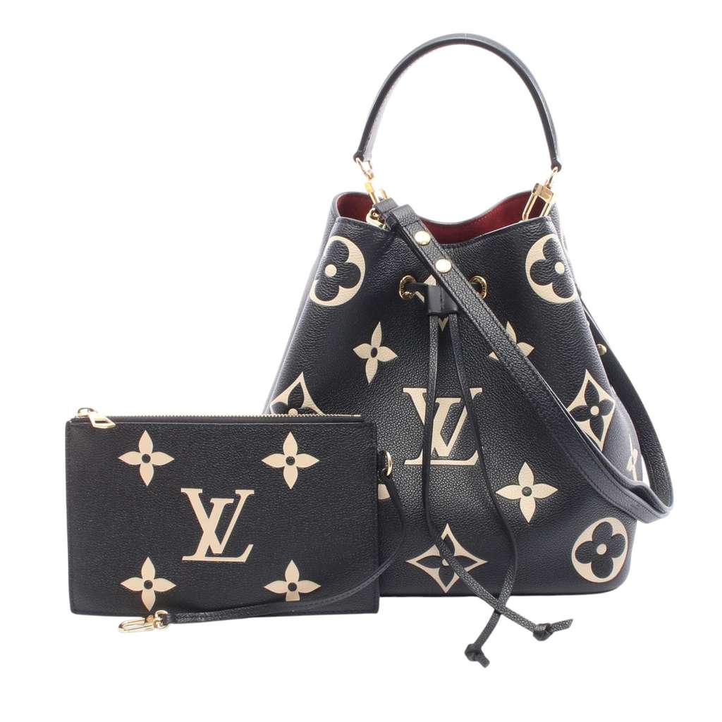 The Neonoe features a monogram empreinte body, a detachable flat top handle, a detachable flat leather strap, an open top with a drawstring closure, and a zip pouch inclusion.