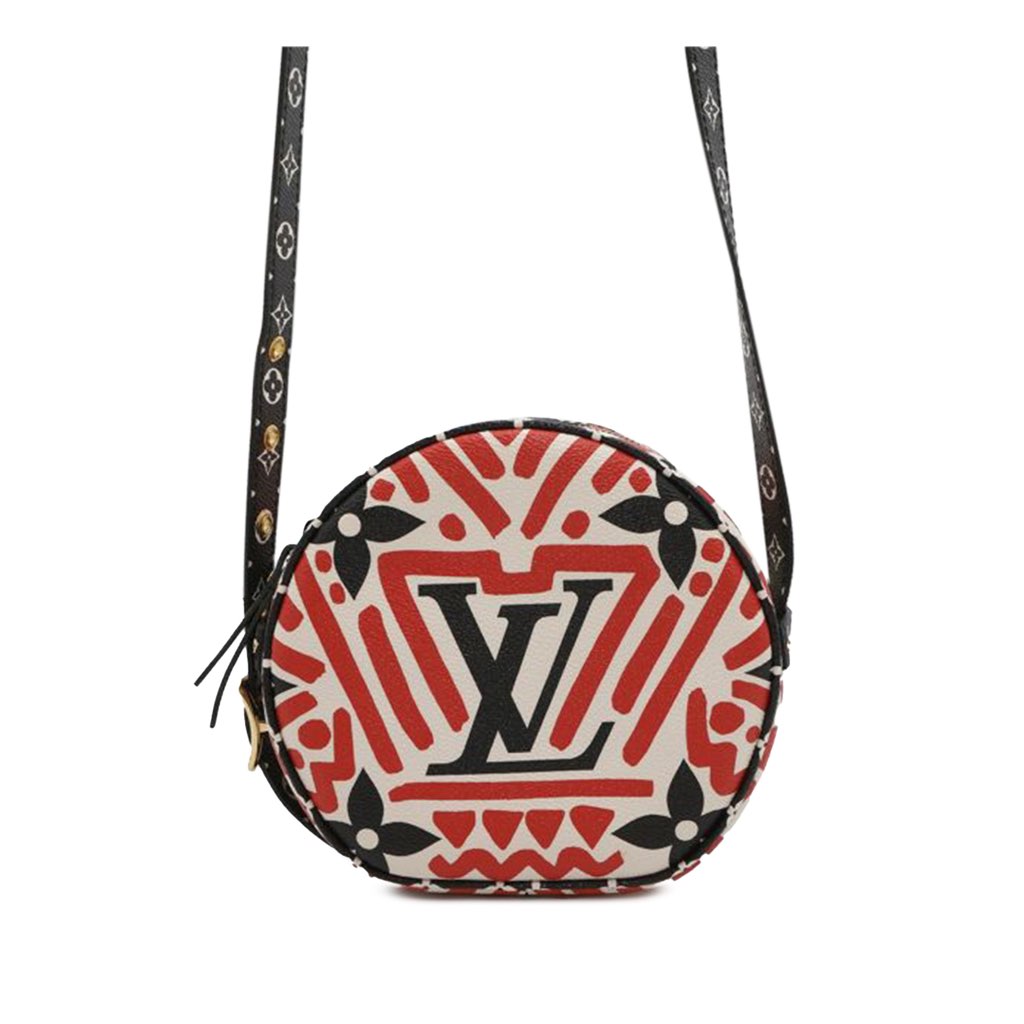 The Crafty Boite Chapeaux Souple features a monogram canvas body, an adjustable flat strap, a top zip closure, and an interior slip pocket.
