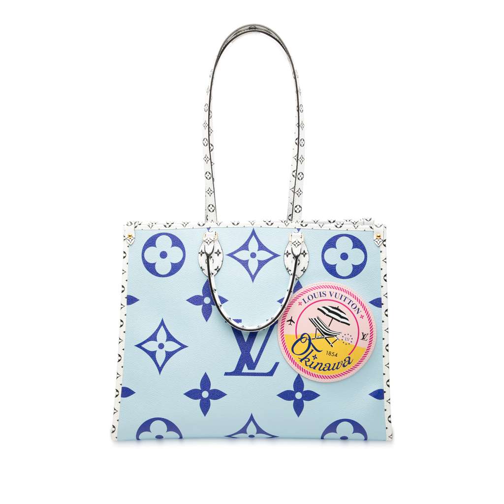 The Onthego features a monogram giant canvas body, rolled handles, flat shoulder straps, an open top with lobster clasp closure, and interior zip and slip pockets.
