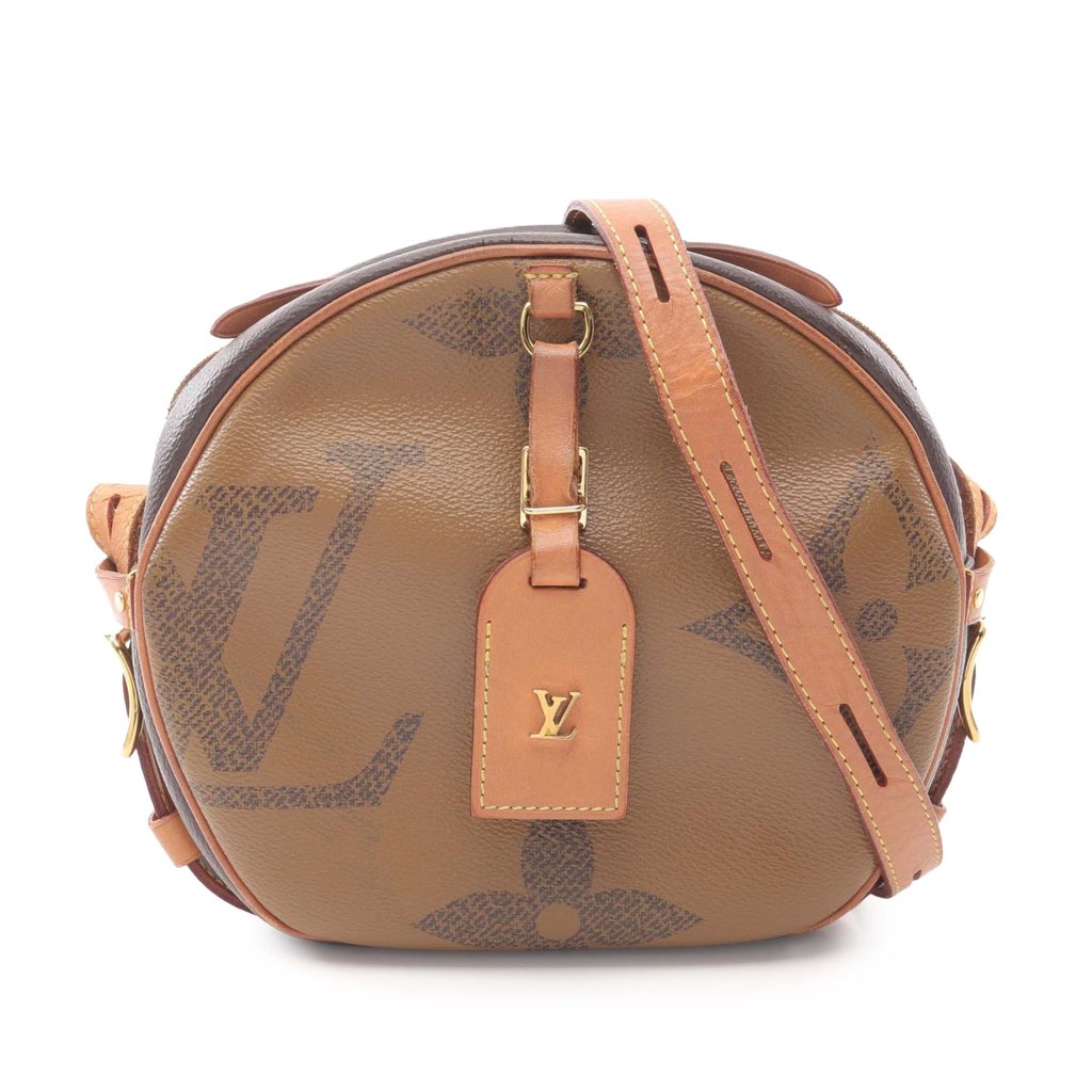 The Boite Chapeau Souple features a monogram reverse canvas body with vachetta leather trim, an adjustable flat vachetta leather strap, a top zip closure, an exterior back slip pocket, and an interior slip pocket.
