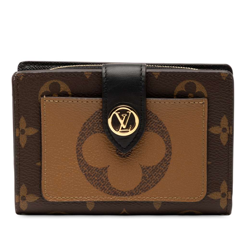 The Juliette Wallet features a monogram canvas body, a flap tab with press stud closure, an exterior front slip pocket, an exterior back zip compartment, and interior slip pockets.
