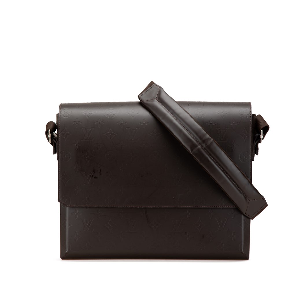 The Fonzie features a monogram glace leather body, a back exterior slip pocket, a flat strap, a front flap, an open top, and interior slip pockets.