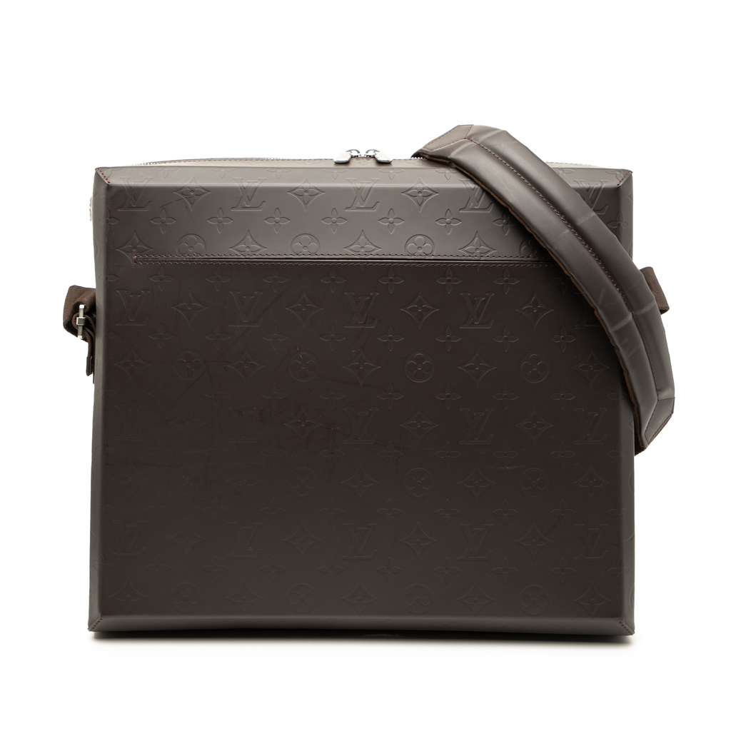 The Steve bag features a monogram glace leather body, an adjustable flat strap, a top zip closure, an exterior slip pocket, and interior slip pockets.
