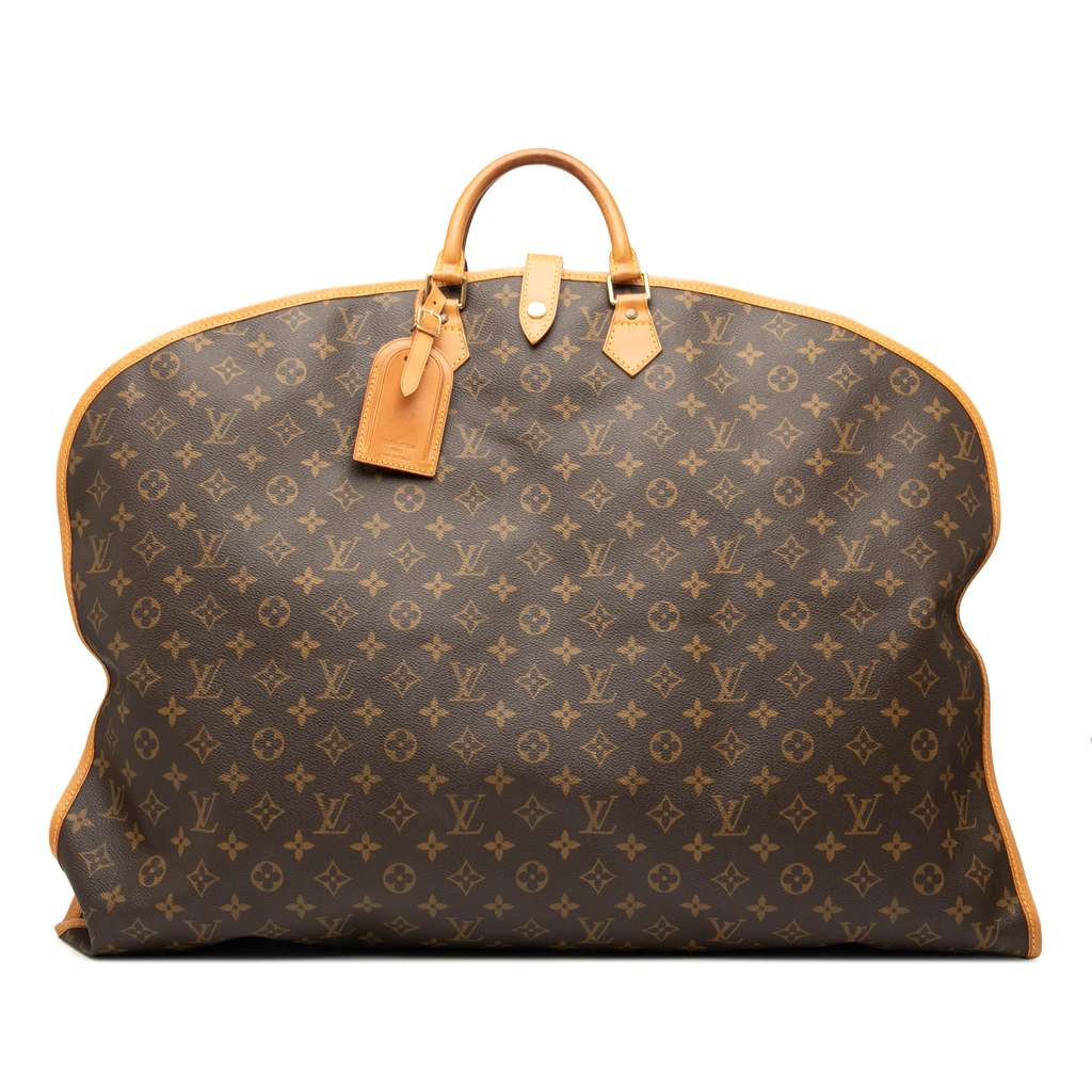 This garment bag features a monogram canvas body with vachetta leather trim, rolled vachetta leather handles, a top strap with snap closure, and a middle zip compartment.
