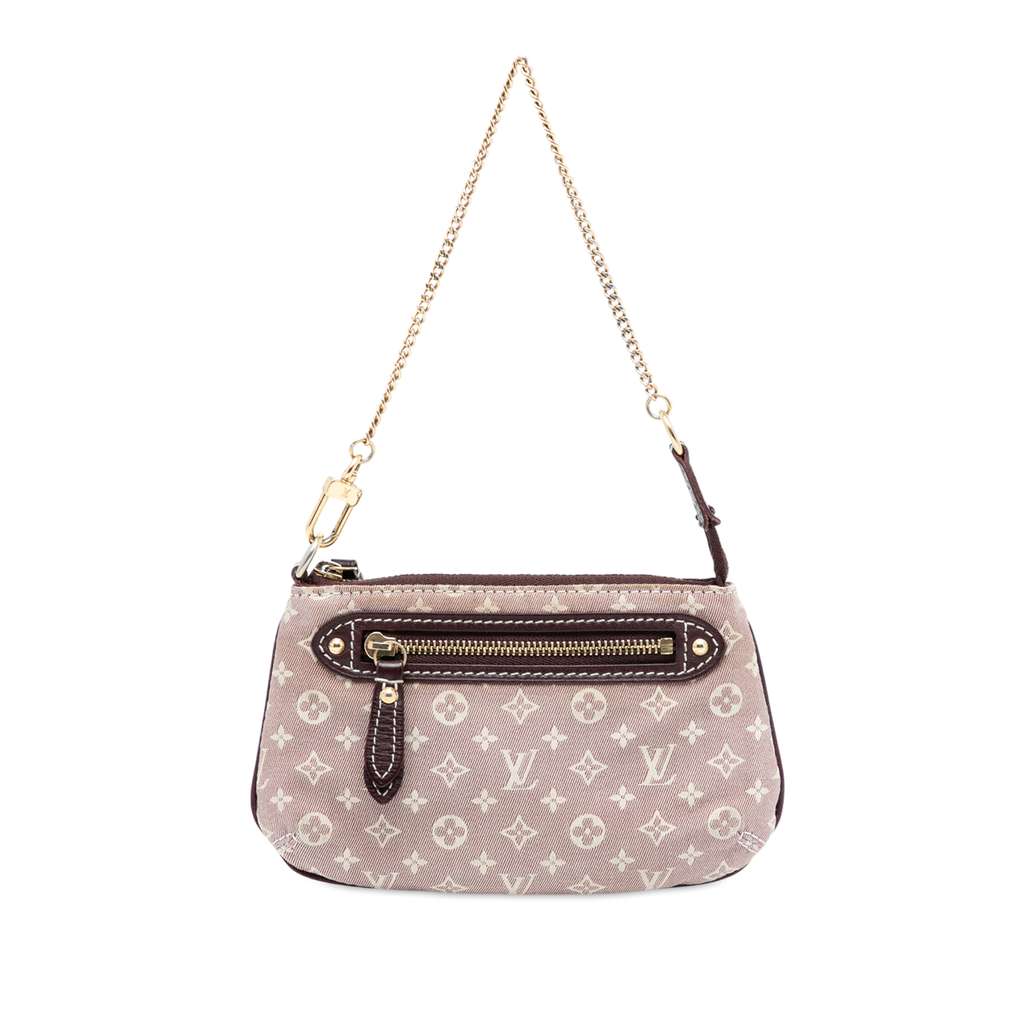 The Mini Pochette Accessoires features a monogram idylle body with leather trim, a chain link handle, a top zip closure, and a front exterior zip pocket.
