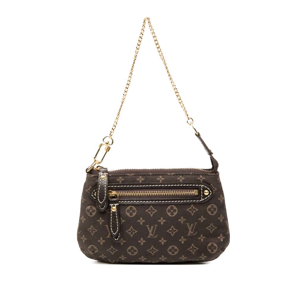 The Mini Pochette Accessoires features a monogram idylle body with leather trim, a chain link handle, a top zip closure, and a front exterior zip pocket.