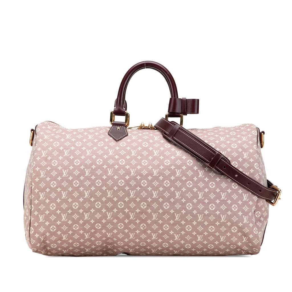 The Speedy Voyage features a monogram idylle body with leather trim, rolled leather handles, a detachable flat leather strap, a top zip closure, and interior slip pockets.