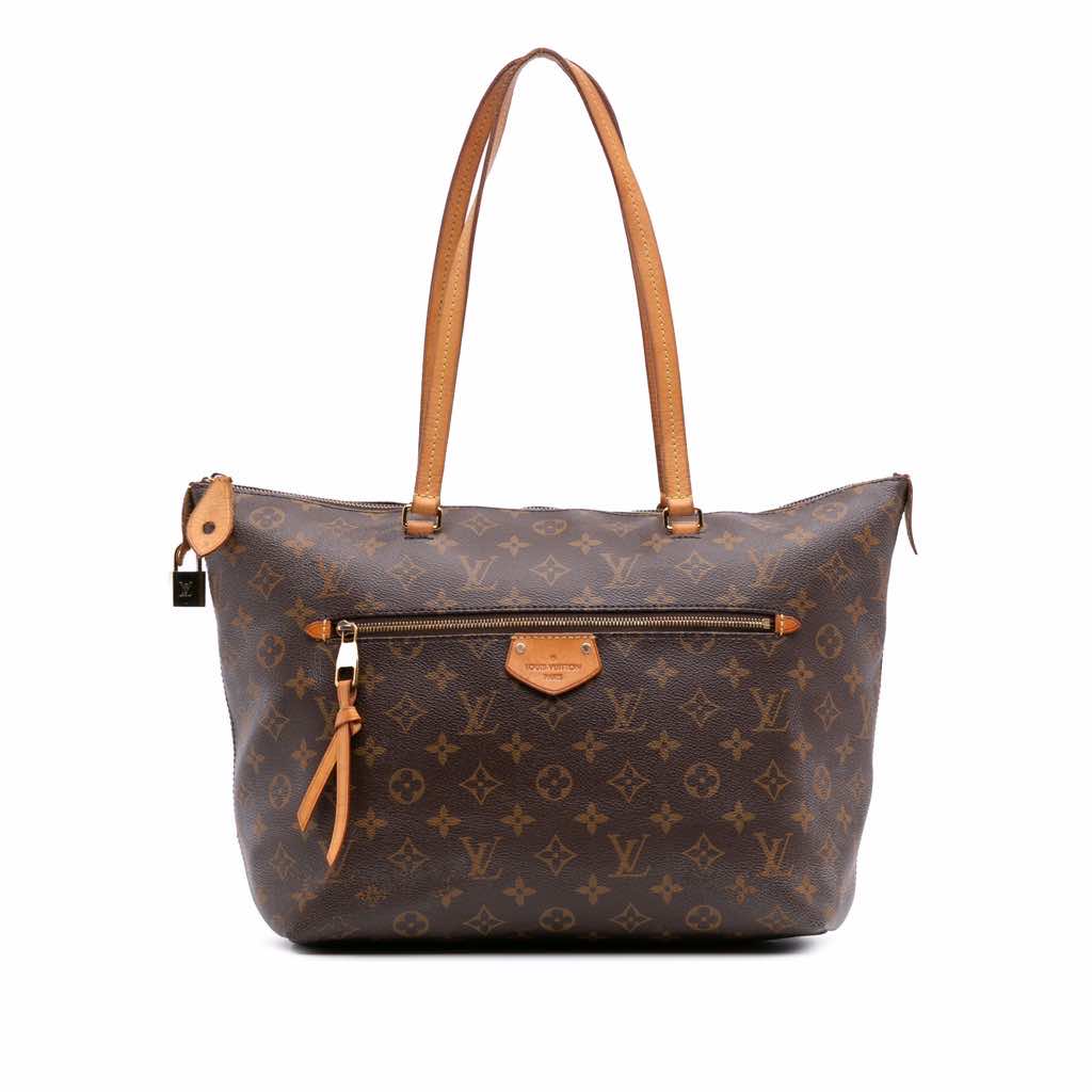 The Iena MM features a monogram canvas body, flat vachetta leather shoulder straps, a top zip closure, an exterior front zip pocket, and interior slip pockets.