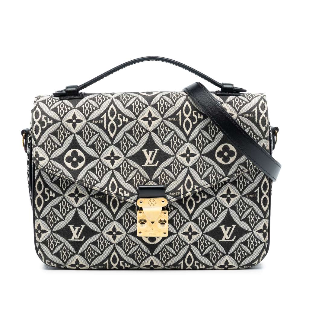 The Pochette Metis features a canvas body, a flat leather top handle, a detachable flat leather shoulder strap, a front flap with an S-lock closure, an exterior back zip pocket, and an interior slip pocket.