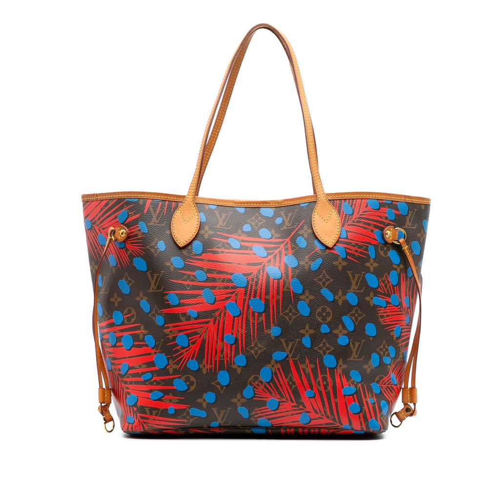 The Neverfull MM features a printed monogram canvas body with vachetta leather trim, flat vachetta leather straps, an open top with a hook closure, an interior zip pocket, and an interior zip pouch.