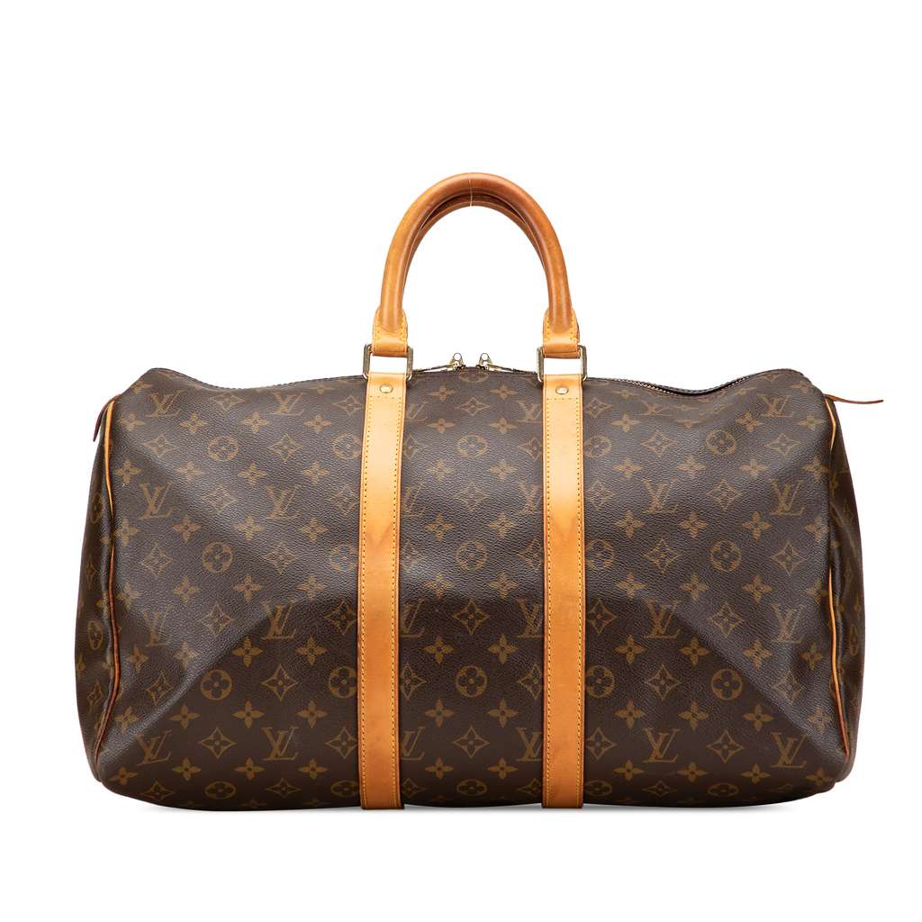 The Keepall 45 features a monogram canvas body with vachetta leather trim, rolled vachetta leather handles, and a top zip closure.