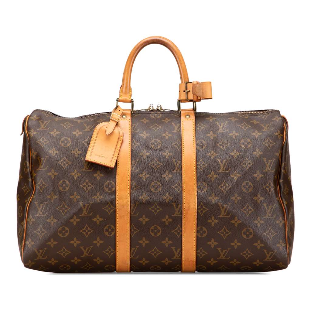 The Keepall 45 features a monogram canvas body with vachetta leather trim, rolled vachetta leather top handles, and a top zip closure.