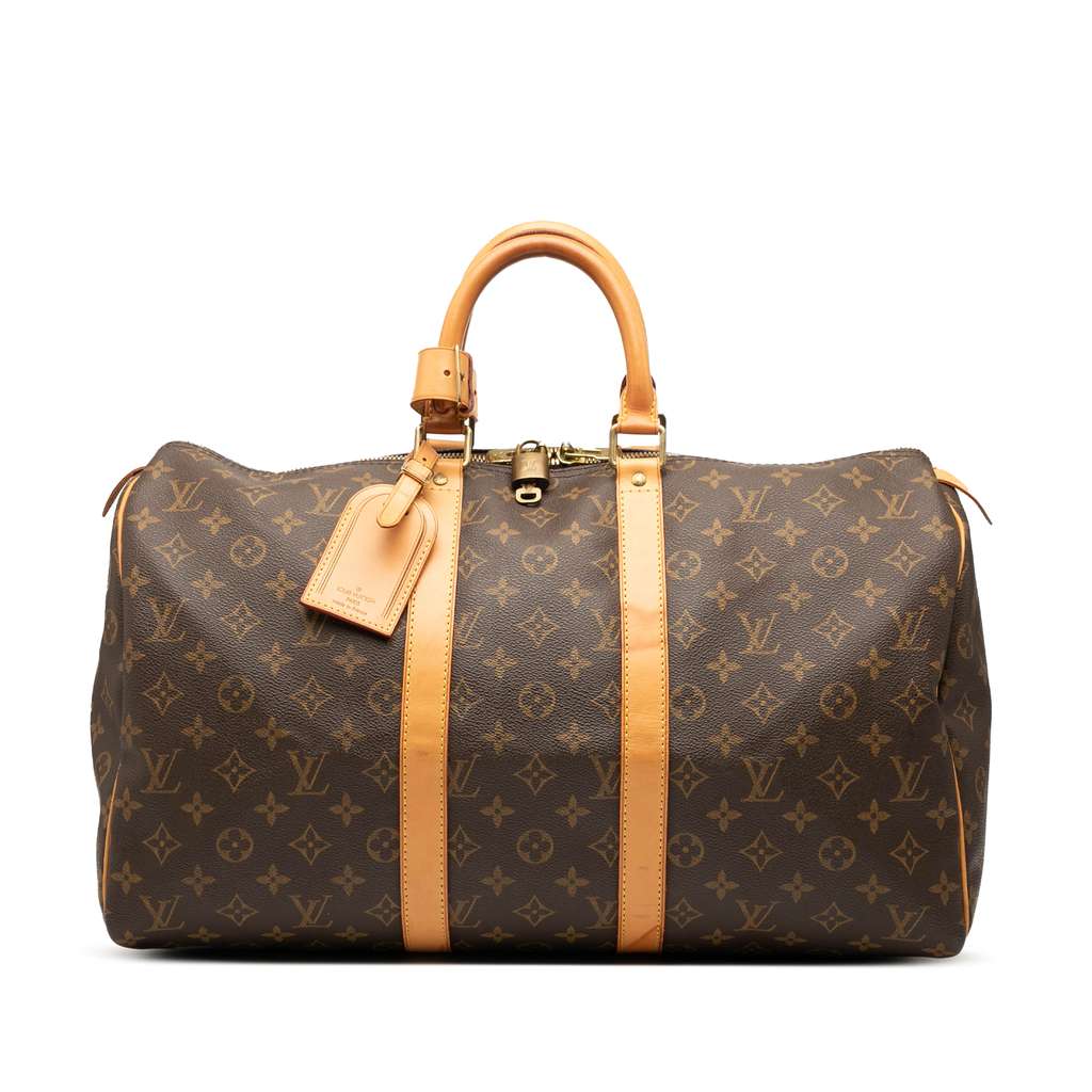 The Keepall 45 features a monogram canvas body with vachetta leather trim, rolled vachetta leather handles, and a top zip closure.