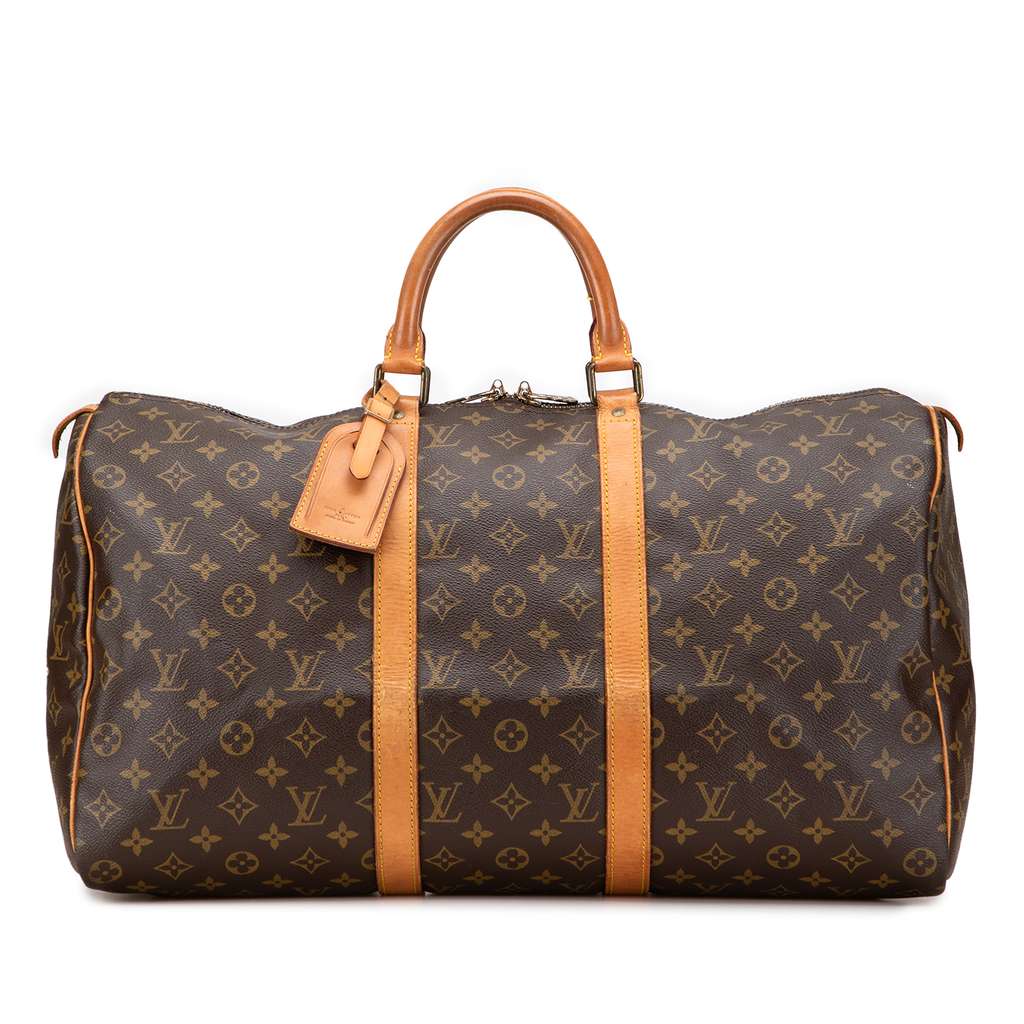 The Keepall 50 features a monogram canvas body with vachetta leather trim, rolled vachetta leather handles, and a top zip closure.