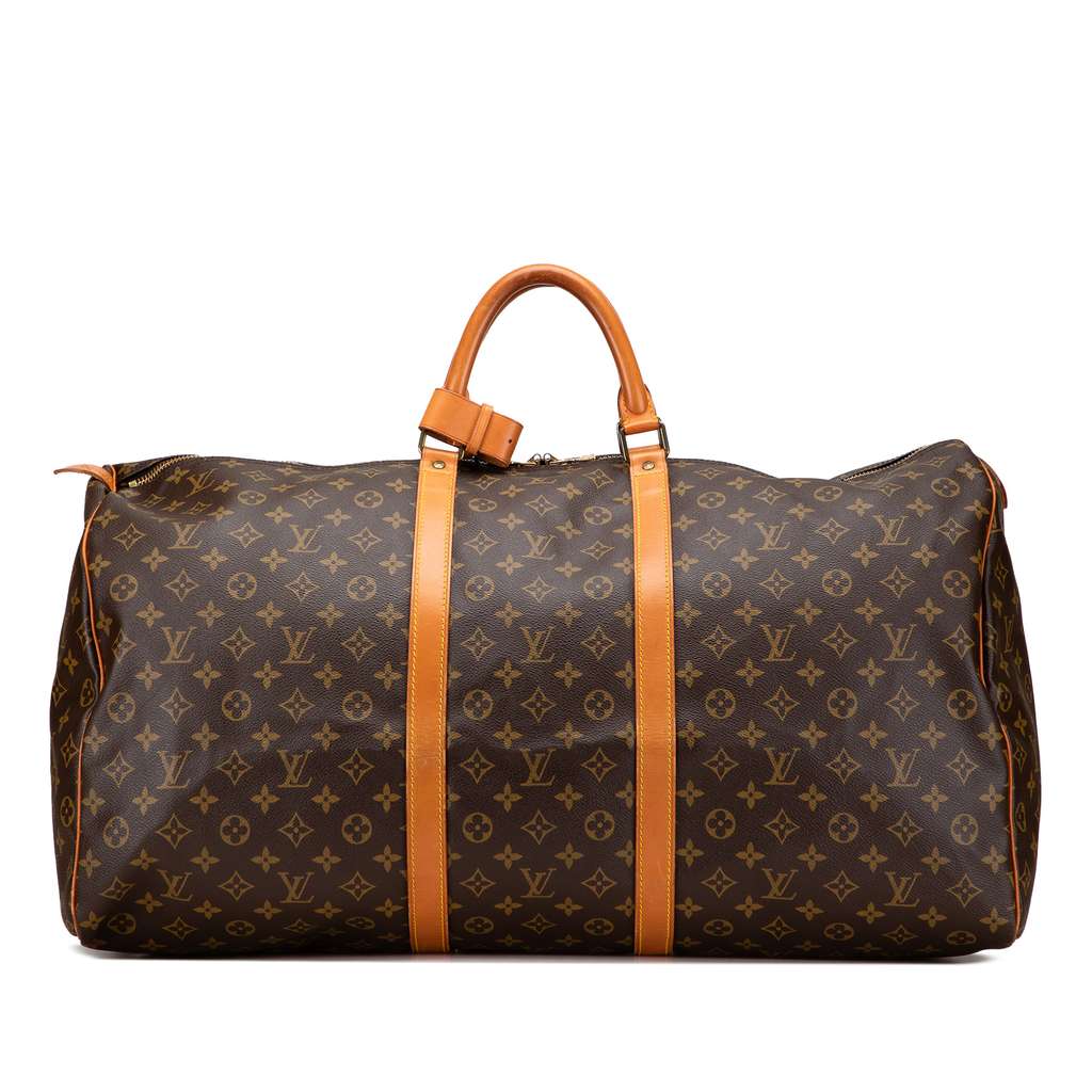 The Keepall 60 features a monogram canvas body with vachetta leather trim, rolled vachetta leather handles, and a top zip closure.