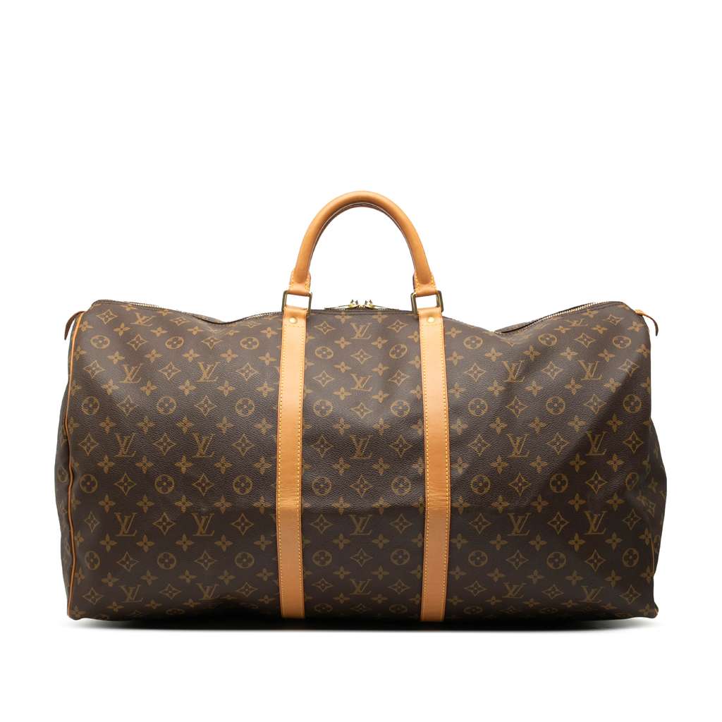 The Keepall 60 features a monogram canvas body, rolled vachetta leather handles, and a top zip closure.