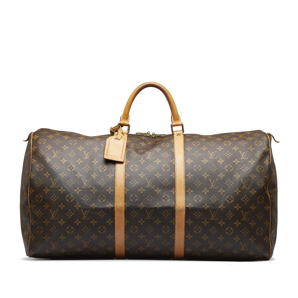 The Keepall 60 features a monogram canvas body, rolled vachetta leather handles, and a top zip closure.