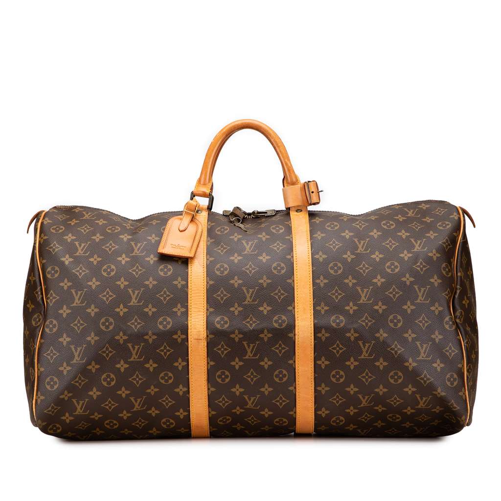 The Keepall 60 features a monogram canvas body with vachetta leather trim, rolled vachetta leather handles, and a top zip closure.