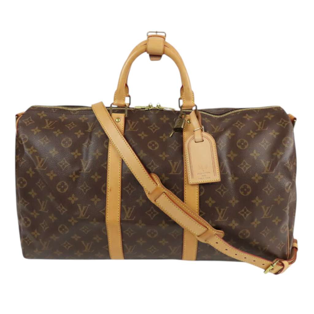 The Keepall Bandouliere 50 features a monogram canvas body, rolled vachetta leather handles, a detachable vachetta leather shoulder strap, and a top zip closure.