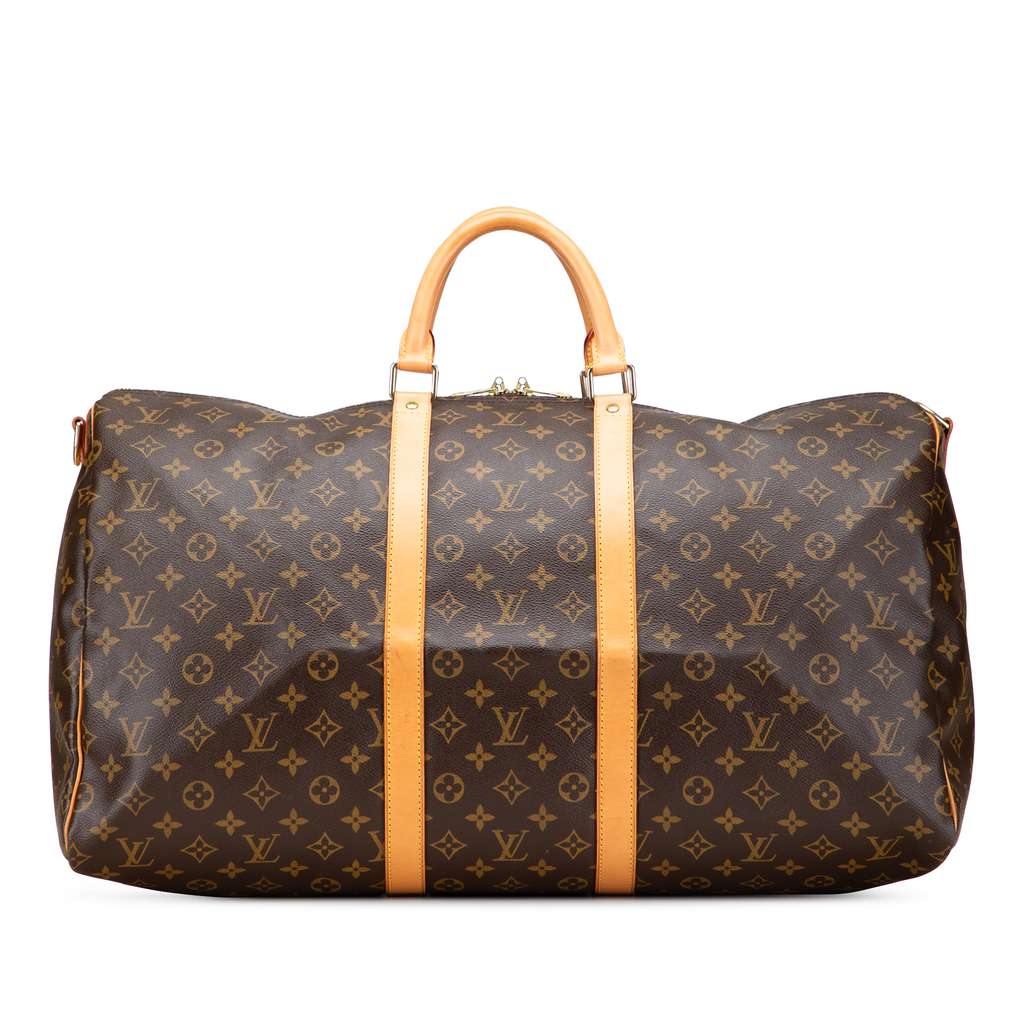 The Keepall Bandouliere 55 features a monogram canvas body with vachetta leather trim, rolled vachetta leather top handles, and a top zip closure.