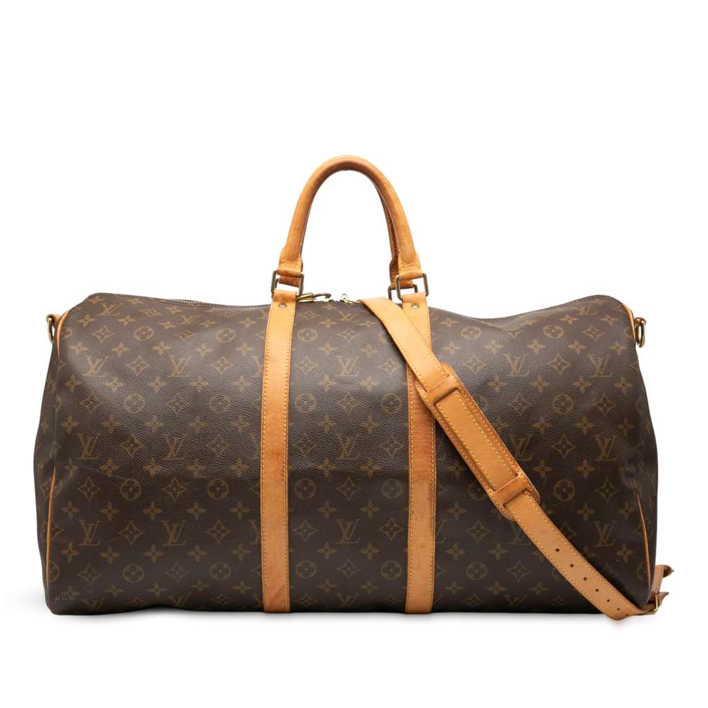 The Keepall Bandouliere 55 features a monogram canvas body with vachetta leather trim, rolled vachetta leather handles, a detachable shoulder strap, and a top zip closure.