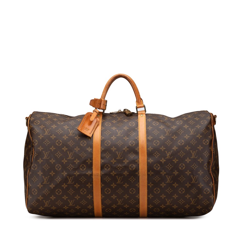 The Keepall Bandouliere 60 features a monogram canvas body with vachetta leather trim, rolled vachetta leather handles, and a top zip closure.