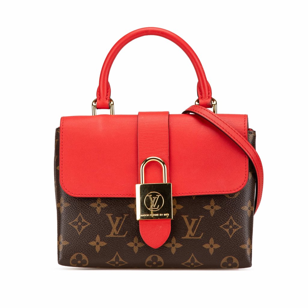 The Locky BB features a monogram canvas body, a rolled leather top handle, a detachable flat leather strap, a front leather flap with a padlock closure, and an interior slip pocket.