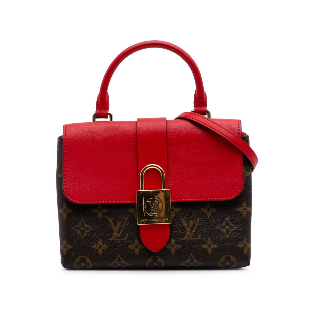 The Locky BB features a monogram canvas body, a rolled leather top handle, a detachable flat leather strap, a front leather flap with a padlock closure, and an interior slip pocket.