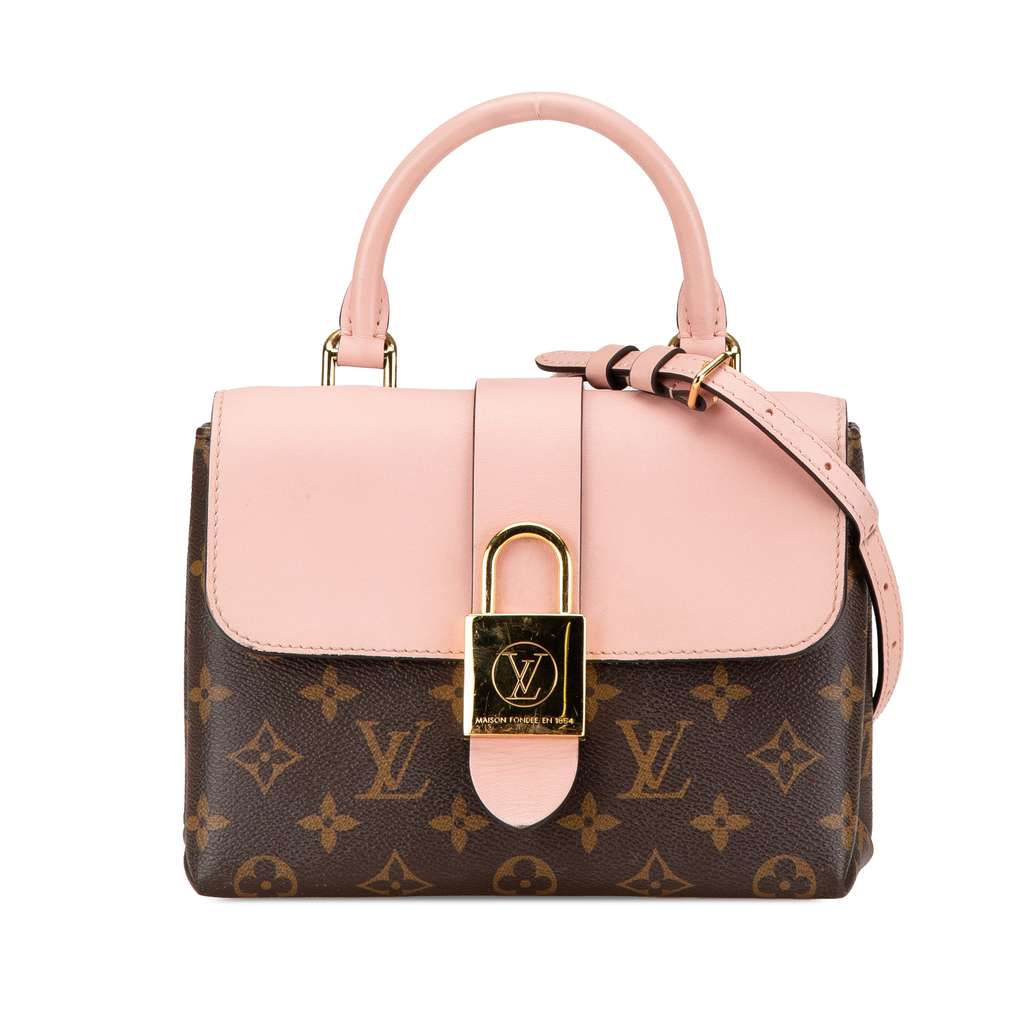 The Locky BB features a monogram canvas body, a rolled leather top handle, a detachable flat leather strap, a front flap with a padlock closure, and an interior slip pocket.